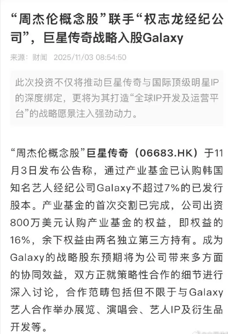 虎撲11月03日訊 周杰倫概念股“巨星傳奇”今日發(fā)布公告稱入股權(quán)志龍經(jīng)紀公司 Galaxy,成為Galaxy的板周戰(zhàn)略股東。