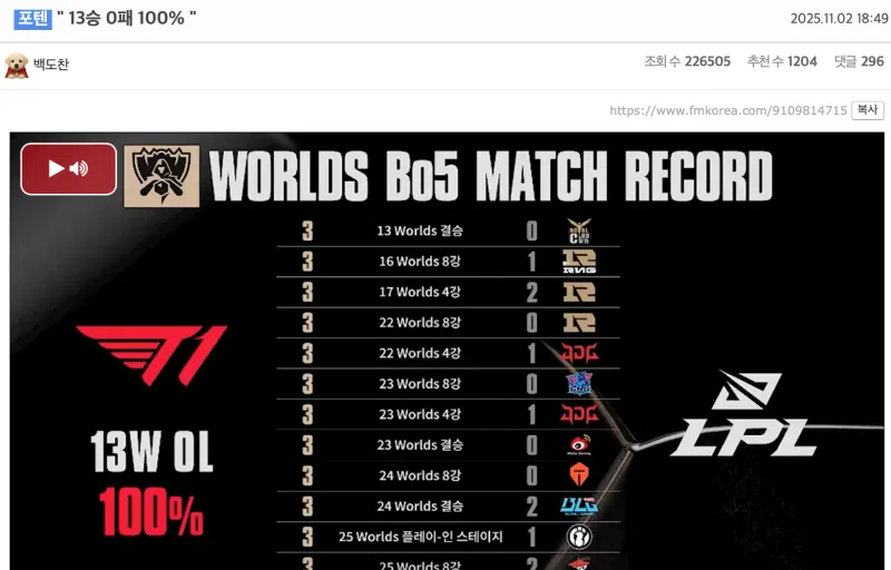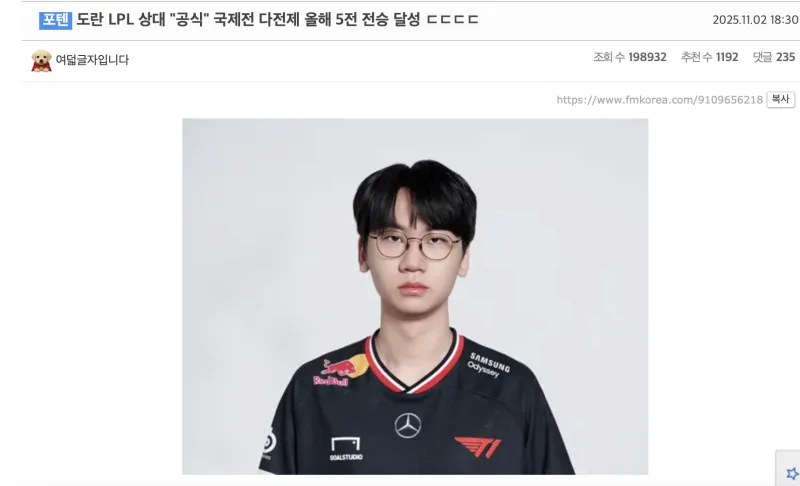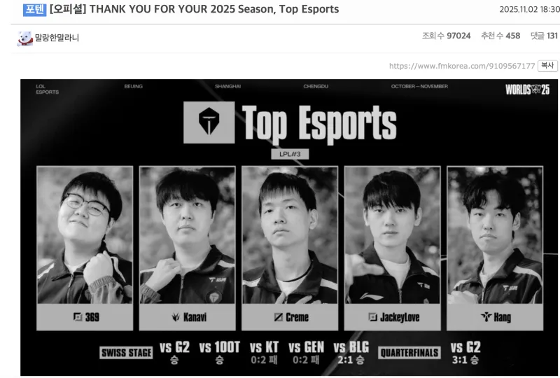 虎撲11月2日訊 2025英雄聯(lián)盟全球總決賽半決賽T1以3比0戰(zhàn)勝TES晉級(jí)決賽,賽后韓國(guó)網(wǎng)友對(duì)此展開熱議,部分熱門評(píng)論翻譯如下(未經(jīng)允許禁止轉(zhuǎn)載,搬運(yùn)截圖)