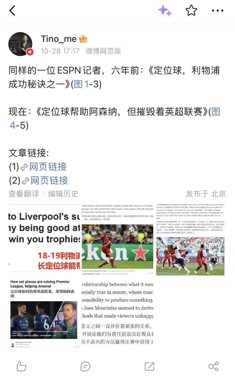 而同樣此作者,毀英在不久之前發(fā)文聲稱,雙標(biāo)定位球讓阿森納贏得比賽,阿森但是定位卻毀了英超,讓英超變得難看和缺乏創(chuàng)造力。球正