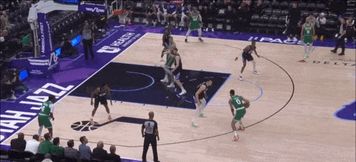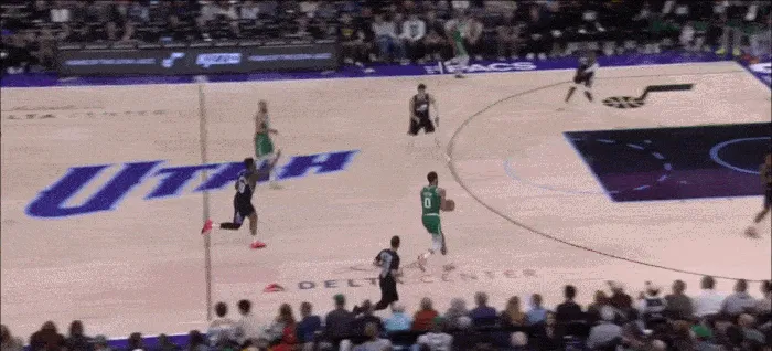 看到塔圖姆半轉(zhuǎn)換的突破,從罰球線移動(dòng)過來完成封蓋