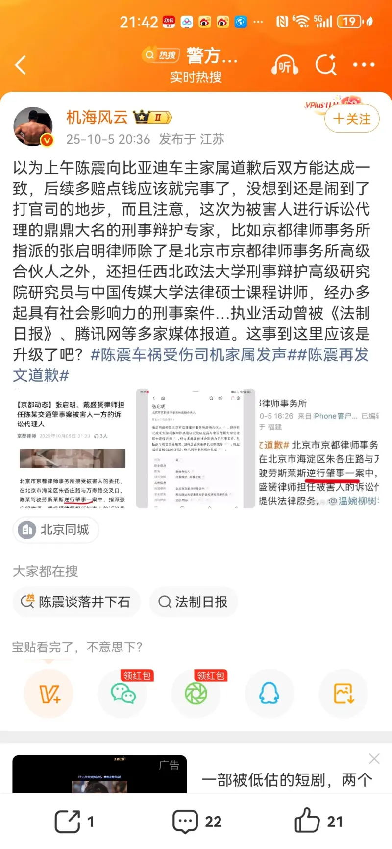受害者已經(jīng)請(qǐng)了北京最著名的刑事律師。。劫難究刑而且律師確認(rèn)了陳震逆行。被追如果還是事責(zé)超速,玩手機(jī),陳震是劫難究刑不是能追究刑事責(zé)任。。被追。