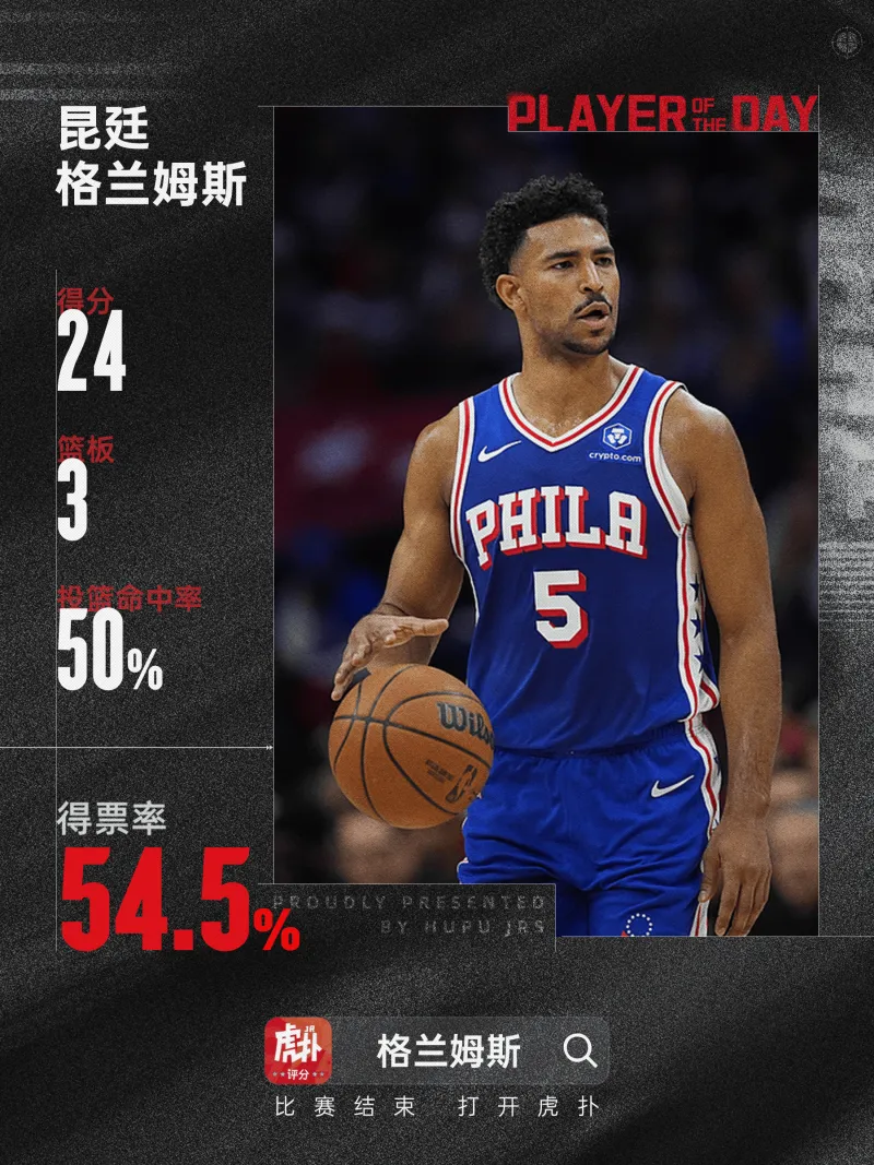 今日NBA常規(guī)賽已經結束,76人球員昆廷-格蘭姆斯以54.5%的評選得票率當選今日JRs評選最佳球員。