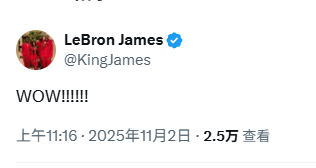 湖人球員勒布朗-詹姆斯發(fā)推稱贊:“wow!發(fā)推!稱贊!太牛”