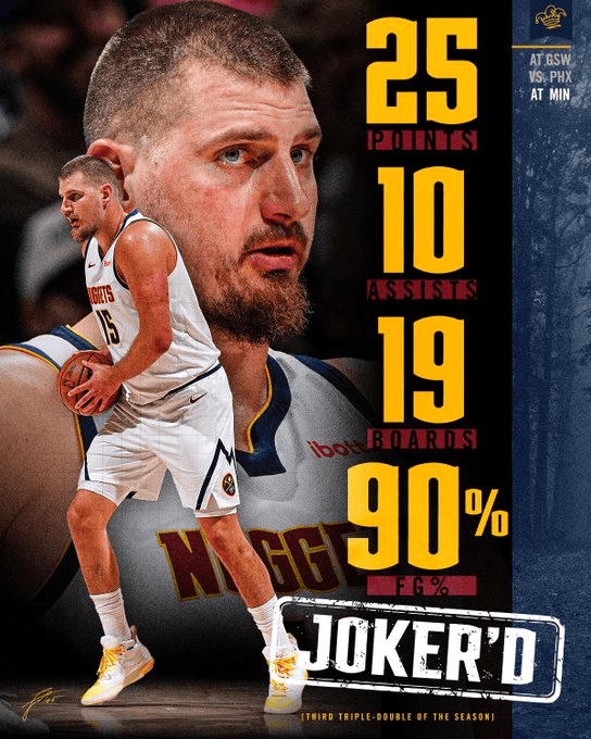 賽后,掘金官方曬出約基奇的三雙海報(bào),并附文:“又一個(gè)高效的夜晚!”