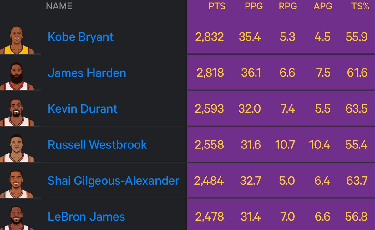 虎撲09月27日訊 今日,美媒Hoop Muse更新社交媒體,媒曬曬出自2000年以來單賽季最高得分榜。自年