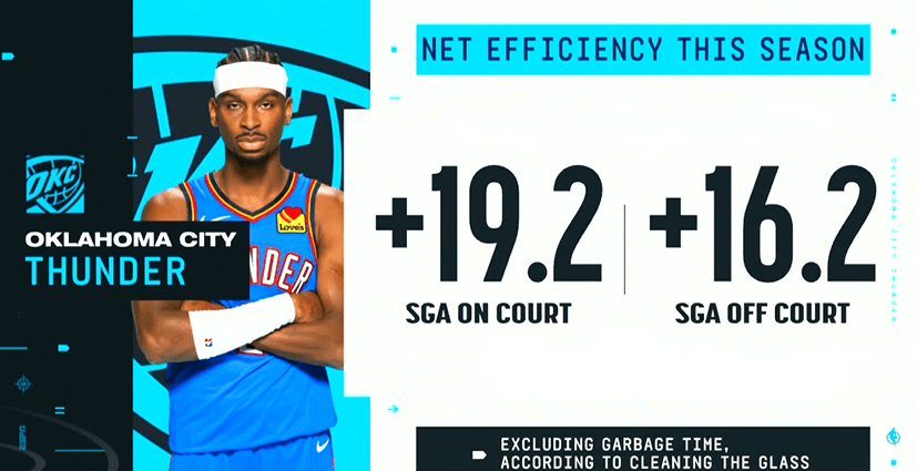 “當(dāng)SGA在場(chǎng)時(shí)雷霆凈效率值為+19.2,凈效不在場(chǎng)時(shí)仍高達(dá)+16.2!仍高”