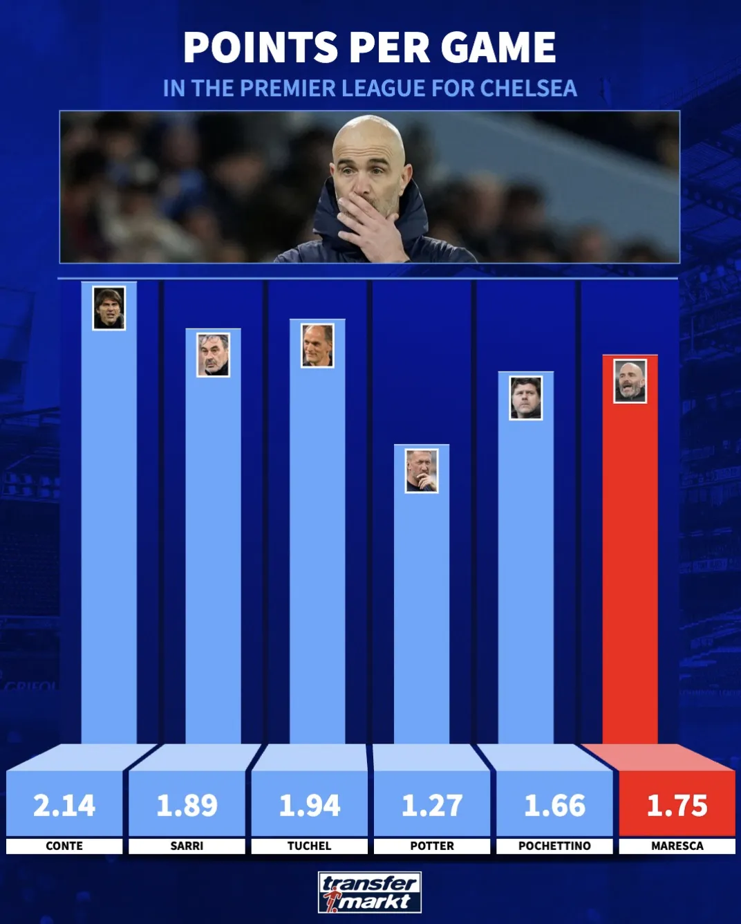 虎撲09月29日訊 德轉(zhuǎn)統(tǒng)計(jì)了馬雷斯卡以及過(guò)去幾任切爾西主帥英超場(chǎng)均得分。