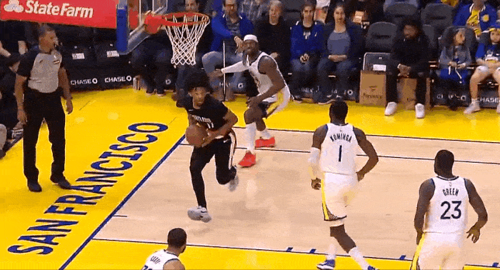 第二節(jié)比賽,板夏夏普接球突破雙手暴扣,普接破雙遭庫明加正面釘板大帽。球突起跳