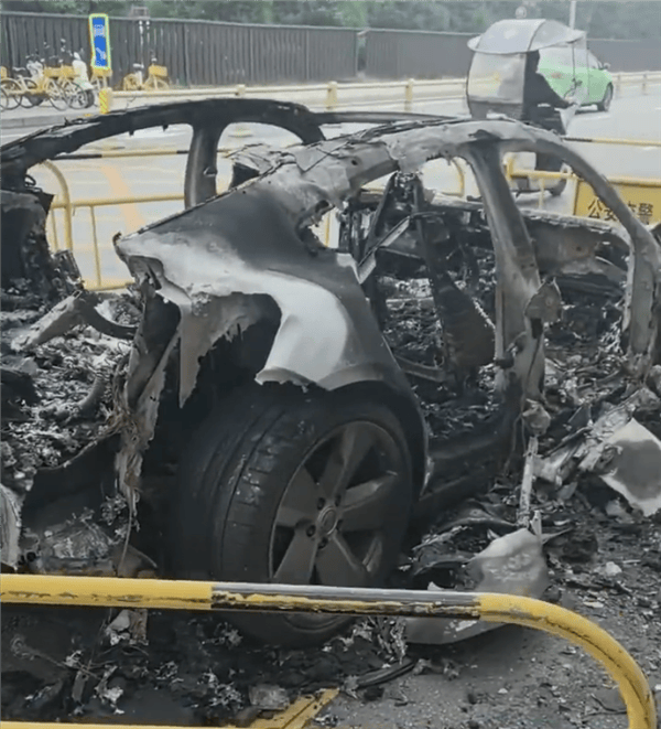 網(wǎng)友拍攝的視頻顯示,這輛保時捷Taycan起火時,車門均已打開,起火集中在車身中部,消防人員將明火撲滅后,車輛已被完全燒毀,變成空殼。