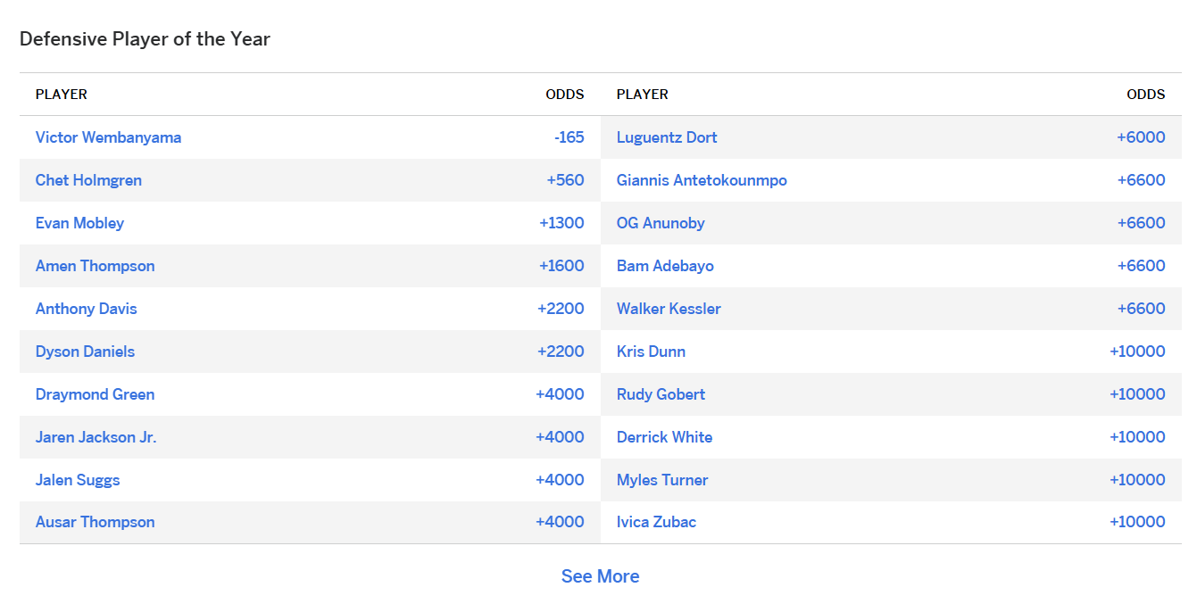 賽季開始前,佳防ESPN更新了新賽季最佳防守球員的守球賠率,具體如下: