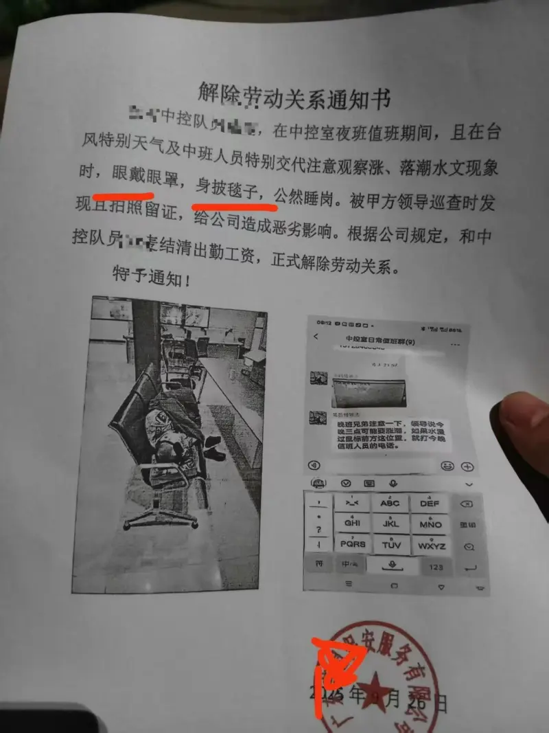 休息了大概10分鐘,突然夜班值班領(lǐng)導(dǎo)進(jìn)來用手機(jī)拍的照片。那時候我還不知道處理的結(jié)果。我堅持到了下班,去醫(yī)院看了一下,確診是呼吸道感染和發(fā)熱。然后我把病例發(fā)給領(lǐng)導(dǎo),我說我要請一天的假。隔了一個小時,書面辭退通知書發(fā)給我。說我上班期間睡覺,被甲方抓到,造成了惡劣的影響,根據(jù)公司規(guī)定,跟我解除勞動關(guān)系。