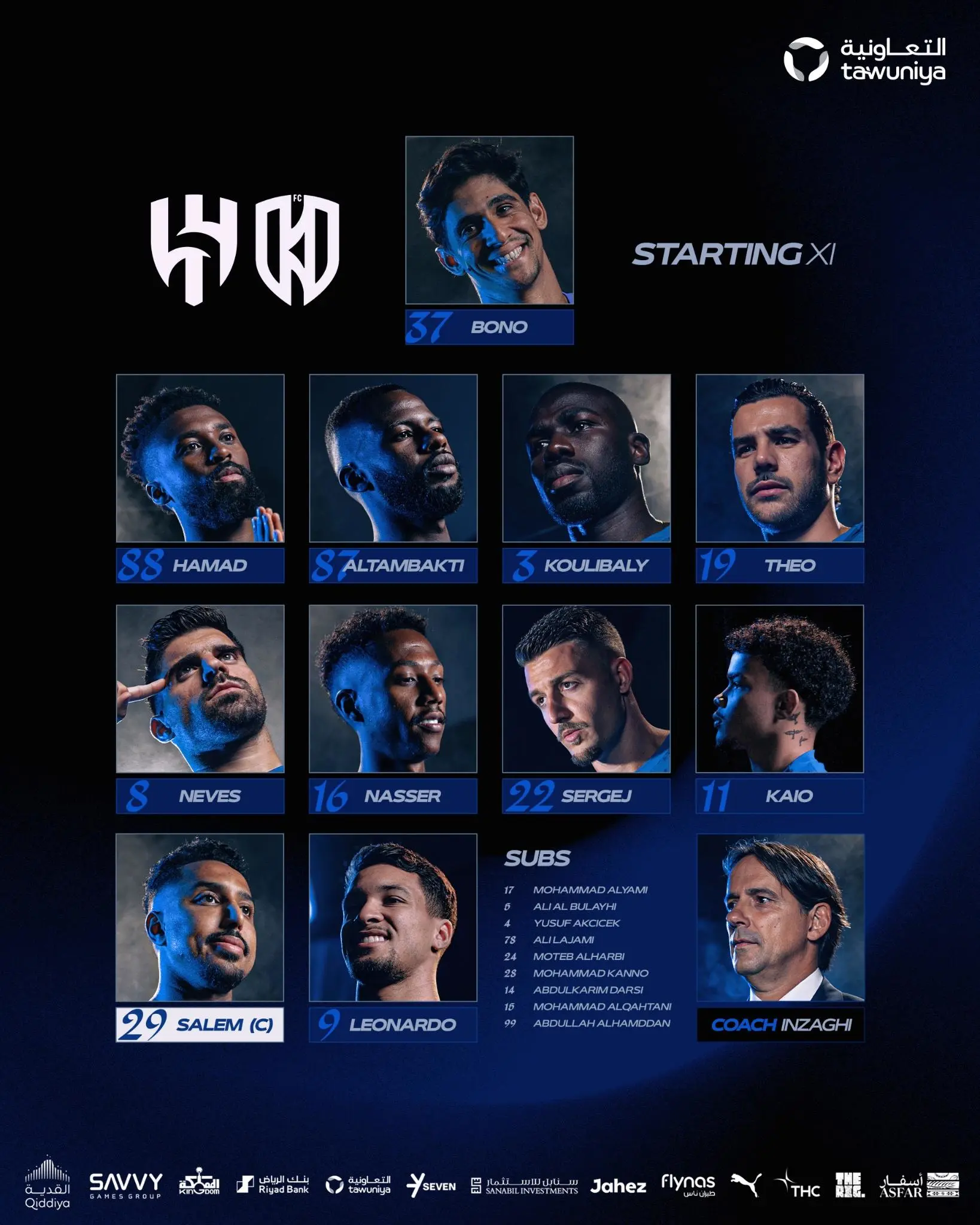 新月首發(fā):37-布努、88-哈馬德、5-阿爾坦巴克蒂、3-庫(kù)利巴利、19-特奧、8-內(nèi)維斯、16-納斯?fàn)枴?2-米林科維奇-薩維奇、11-凱奧、29-多薩里、9-萊昂納多