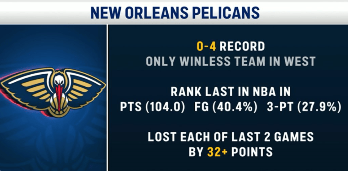 目前鵜鶘0勝4負,是本賽季目前西部唯一一支仍然沒有取得勝利的球隊。