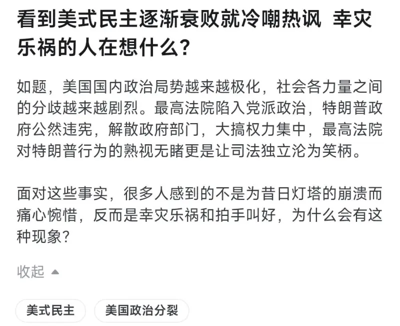 看到美式民主逐漸衰敗就冷嘲熱諷,美式民主幸災(zāi)樂禍的逐漸