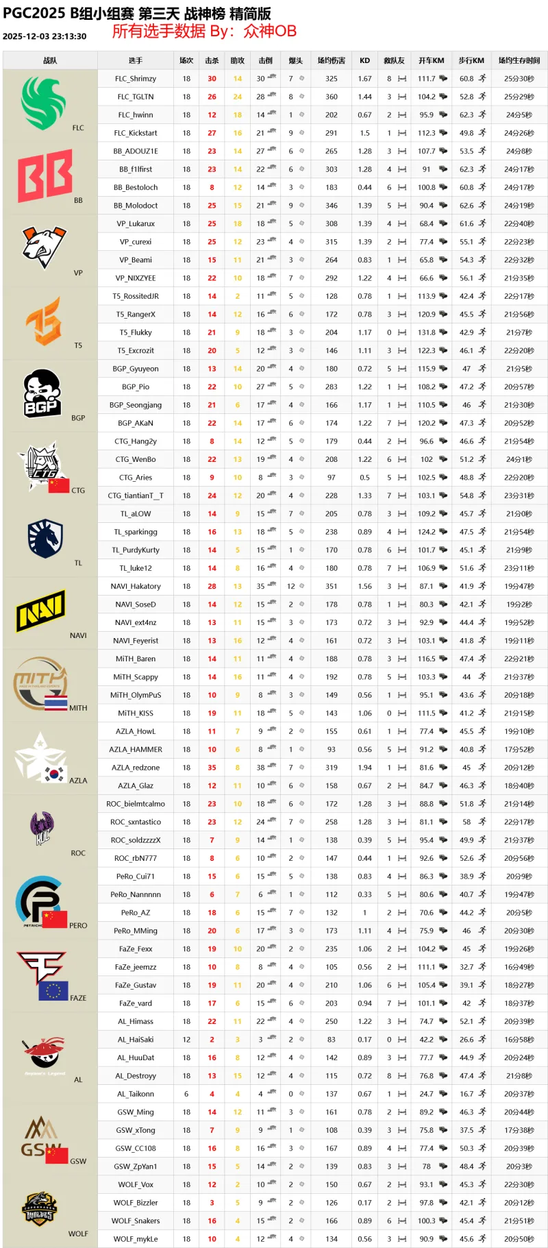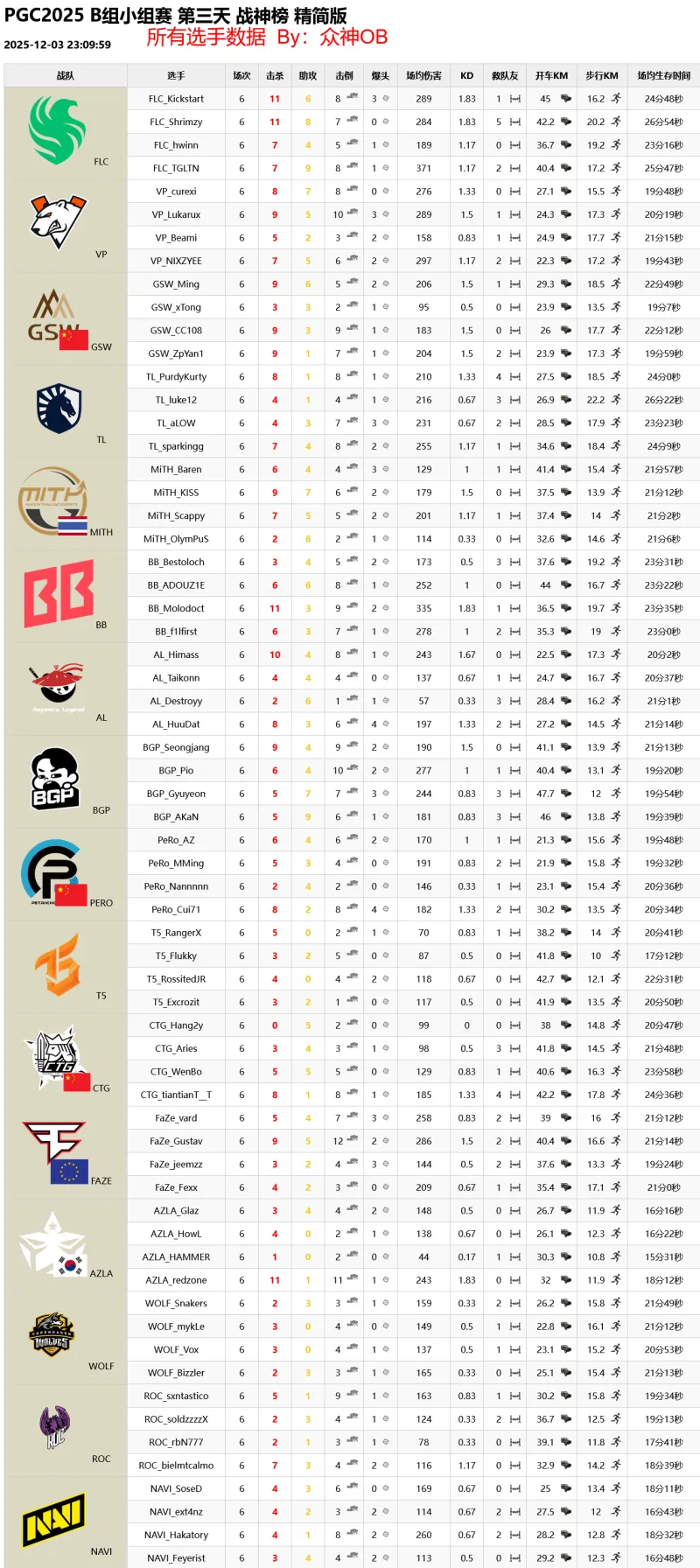 PGC2025 B組小組賽 第三天 積分榜&戰(zhàn)神榜