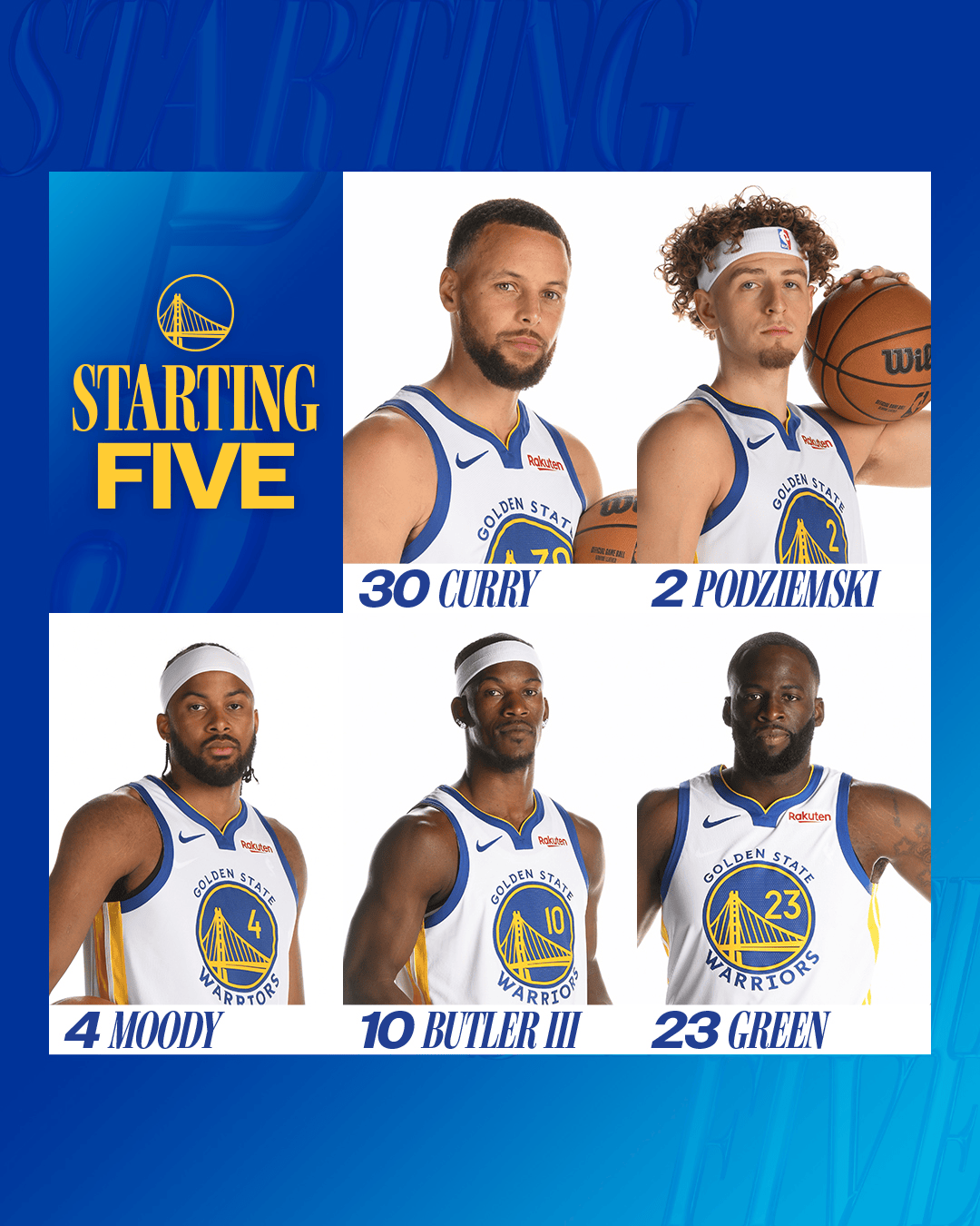 勇士首發(fā):斯蒂芬-庫(kù)里、板勇巴特布蘭丁-波杰姆斯基、士首斯基摩西-穆迪、吉米-巴特勒、德雷蒙德-格林。