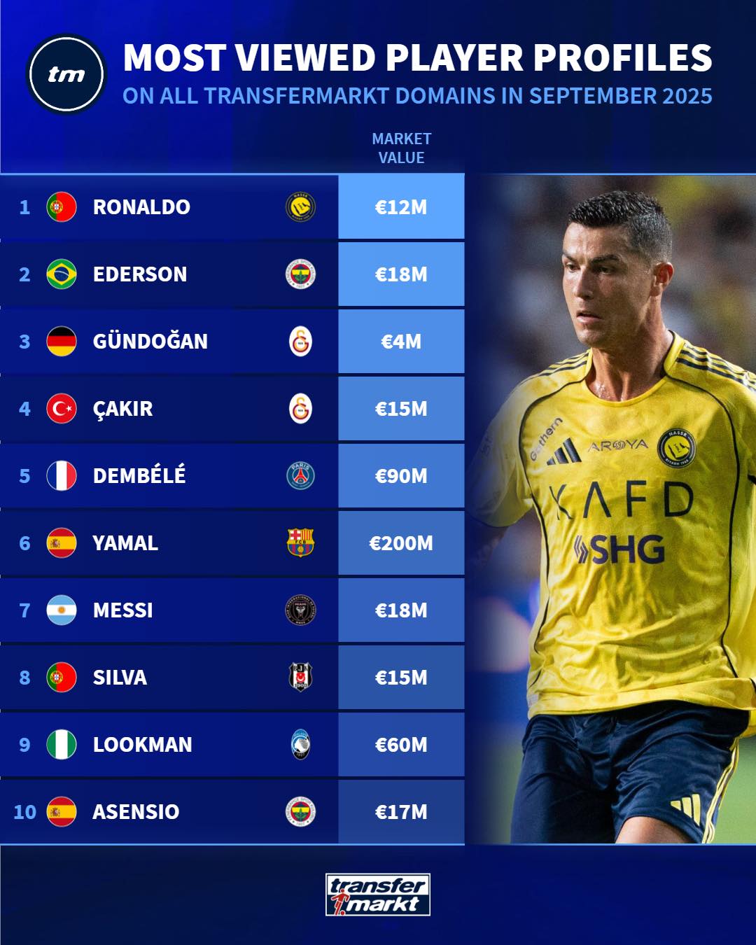 虎撲10月05日訊 德國轉(zhuǎn)會市場統(tǒng)計了9月份在該網(wǎng)站頁面瀏覽量最大的球員,詳情如下: