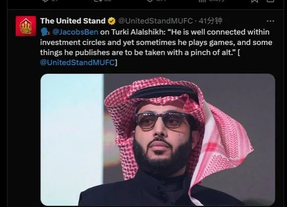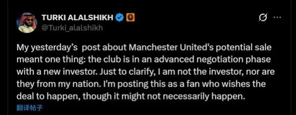①Turki Alalshikh 本人發(fā)話了:“我昨天關(guān)于曼聯(lián)可能出售的消息意味著一件事:俱樂部正與一位新投資者進行深入談判。需要澄清的是,我不是投資者,他們也不是我國家的。我以一名球迷的身份發(fā)帖,希望這筆交易能夠達成,盡管這筆交易不一定會發(fā)生。”