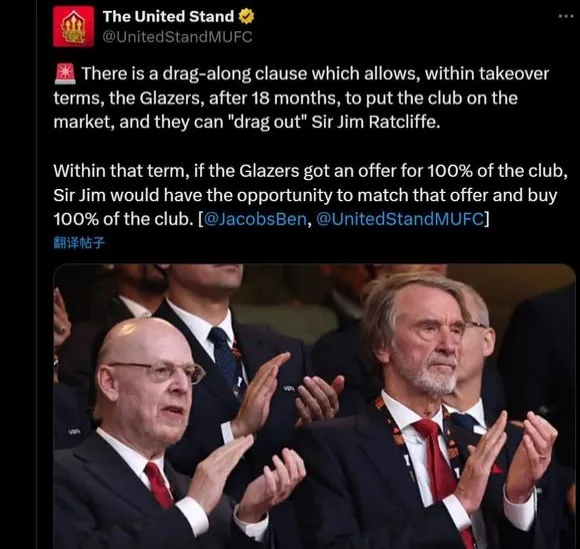 ④Ben Jacobs:有一個強制出售條款,樂部允許格雷澤家族在收購條款規(guī)定的 18 個月后將俱樂部出售,并且他們可以 “拖走” 吉姆?拉特克利夫爵士。
