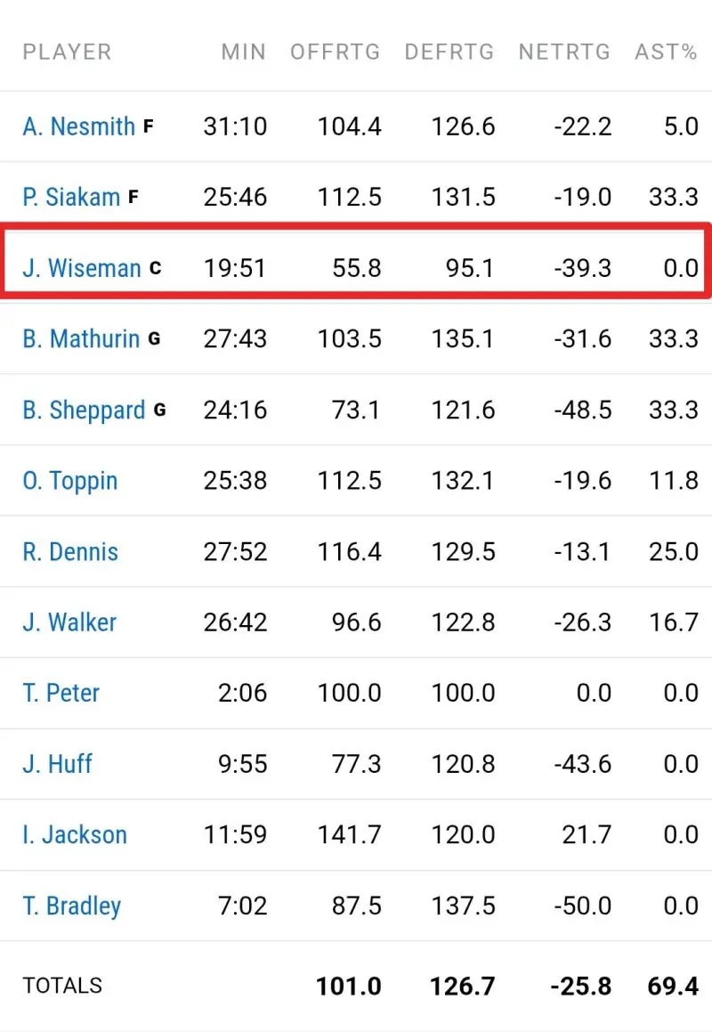 當懷斯曼在場的20分鐘,步行者平均每回合得到0.474分。當懷斯曼不在場時,步行者在41次進攻中平均得到1.182分。
