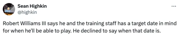 采訪中羅伯特-威廉姆斯表示,他已經(jīng)與球隊訓(xùn)練師確定好了復(fù)出目標,但他拒絕透露具體日期。