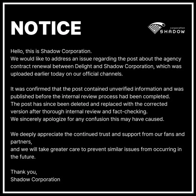 [情報(bào)站]Shadow發(fā)文更正:Delight與經(jīng)紀(jì)公司續(xù)約,抱歉造成困惑