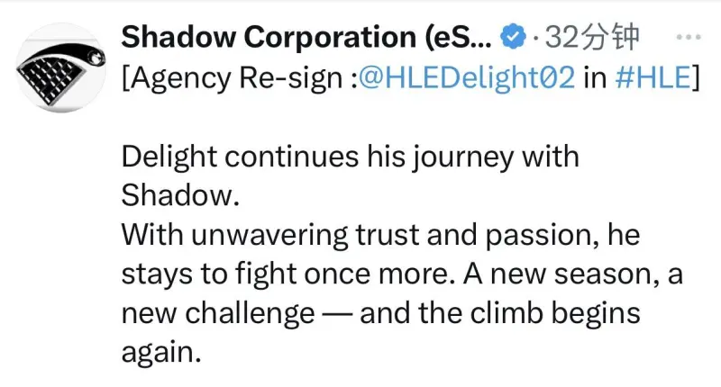我們想就今天早些時(shí)候在我們官方社交媒體發(fā)布的續(xù)約關(guān)于Delight選手和Shadow經(jīng)紀(jì)公司續(xù)約的公告進(jìn)行說明。