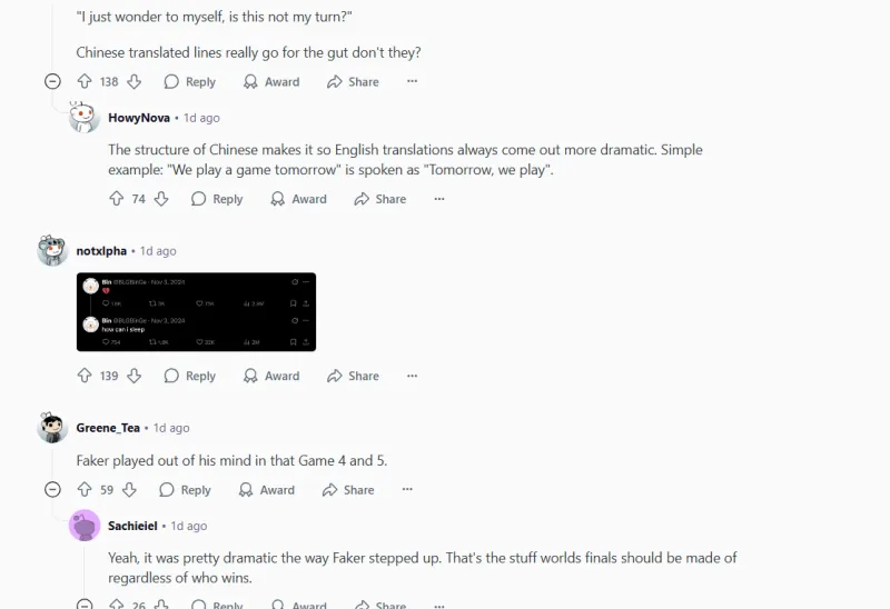 是啊,F(xiàn)aker 那種在關(guān)鍵時(shí)刻站出來(lái)的方式太有戲劇性了。這才是世界賽決賽該有的味道,不論誰(shuí)贏。