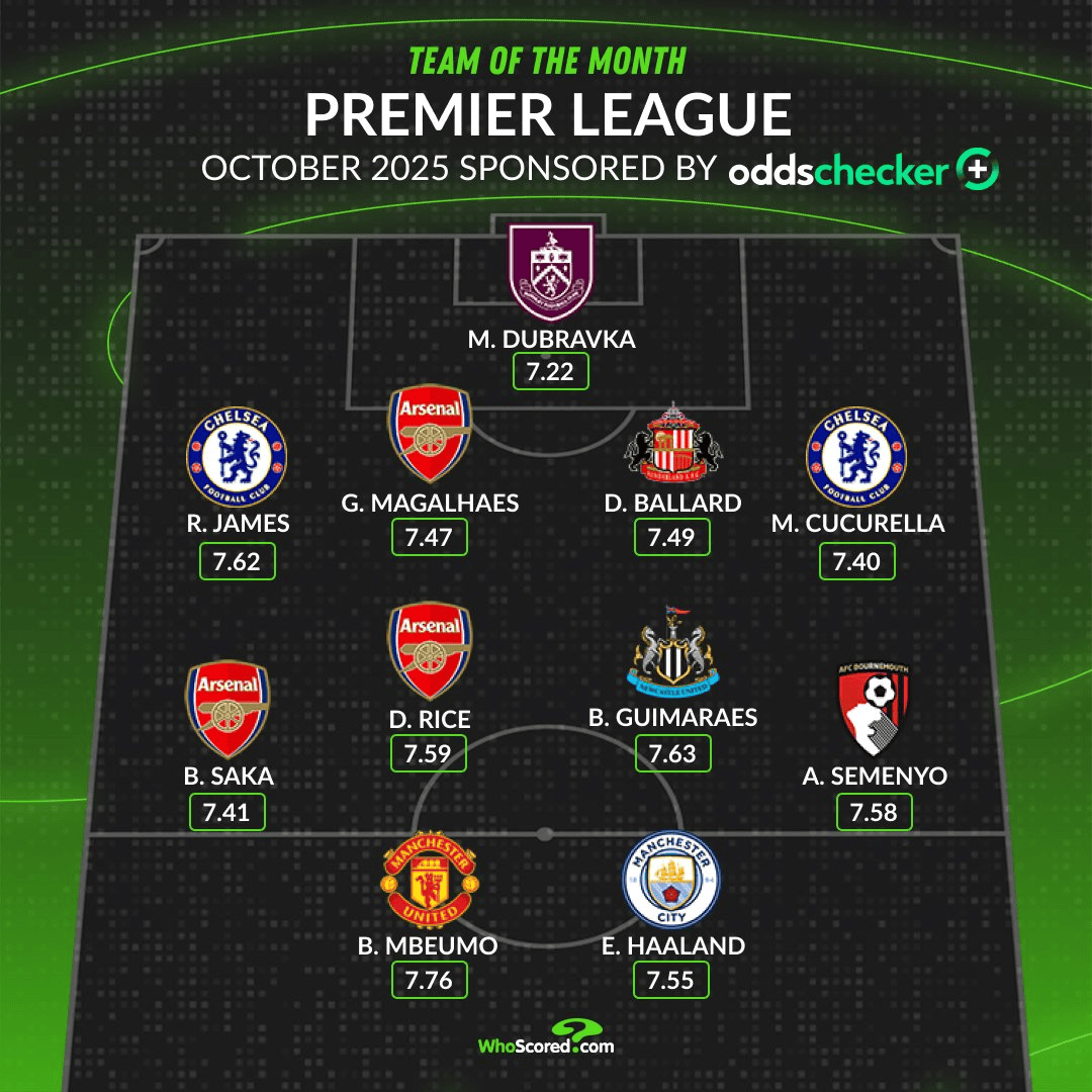 虎撲10月31日訊 whoscored根據(jù)網(wǎng)站統(tǒng)計的評分發(fā)布了英超十月的最佳陣容。