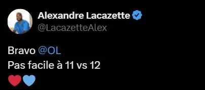 賽后前里昂隊長拉卡澤特更新社媒表達(dá)對本場裁判的得好打不滿,他寫道:干得好,情況里昂!流言里昂????在11打12的板拉不容情況下可不容易。