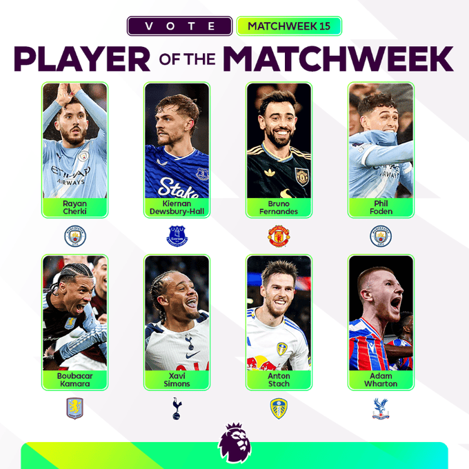 虎撲12月09日訊 英超官方公布聯(lián)賽第15輪最佳球員候選名單: