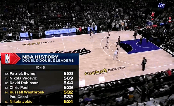歷史兩雙榜排行中,次排次第威少532次排第14,第約約基奇524次排名第16。基奇