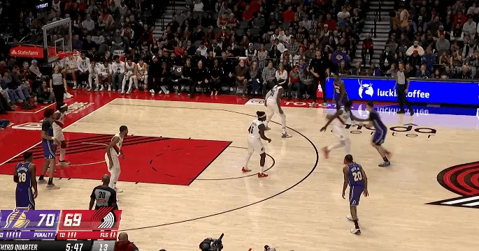 NBA常規(guī)賽,湖人對(duì)陣開(kāi)拓者的球分比賽正在進(jìn)行中。