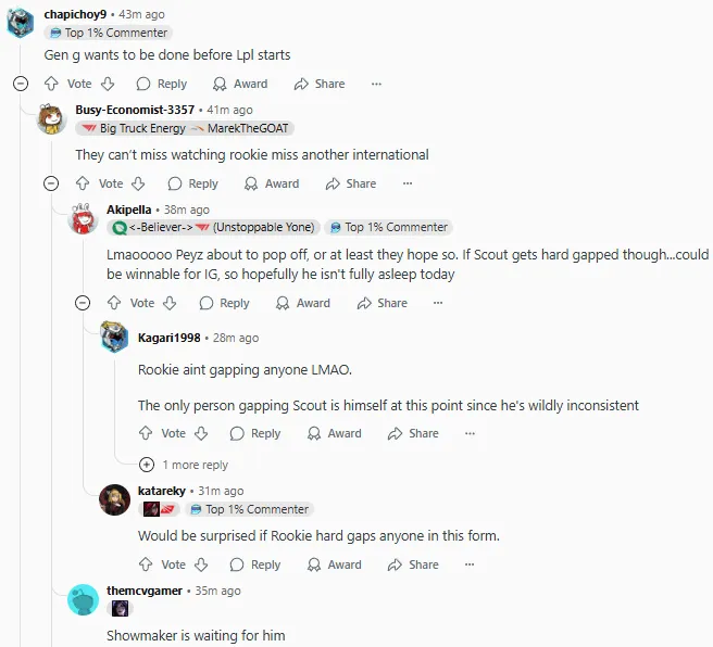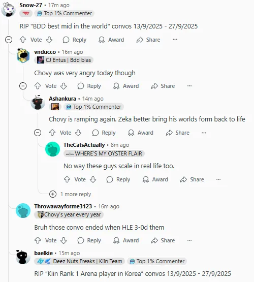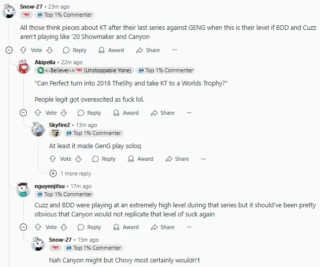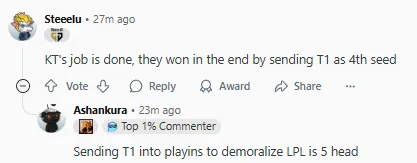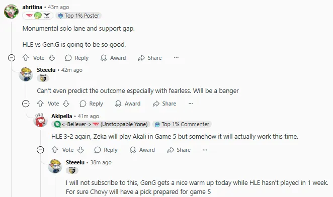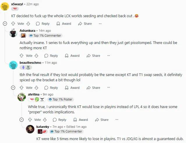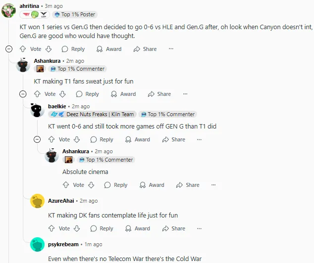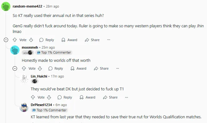 2025LCK季后賽敗者組決賽上GEN以3-0戰(zhàn)勝KT復(fù)仇成功,賽后國(guó)外論壇Reddit引發(fā)熱議,部分評(píng)論翻譯如下: