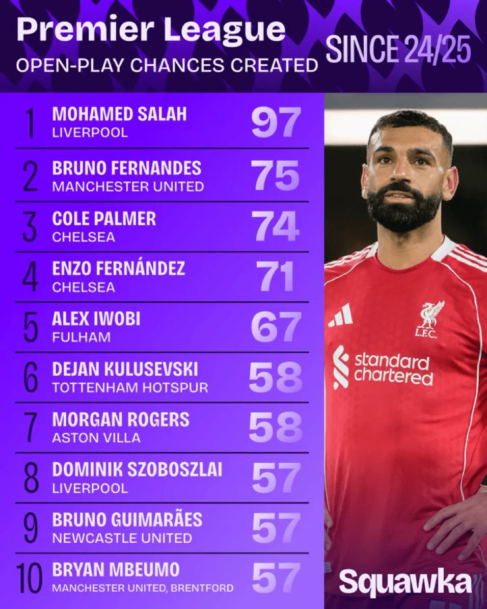 來源:X虎撲10月16日訊 Squawka統(tǒng)計(jì)了自上賽季開始以來,英超聯(lián)賽中運(yùn)動(dòng)戰(zhàn)創(chuàng)造機(jī)會(huì)次數(shù)最多的薩拉賽季球員。