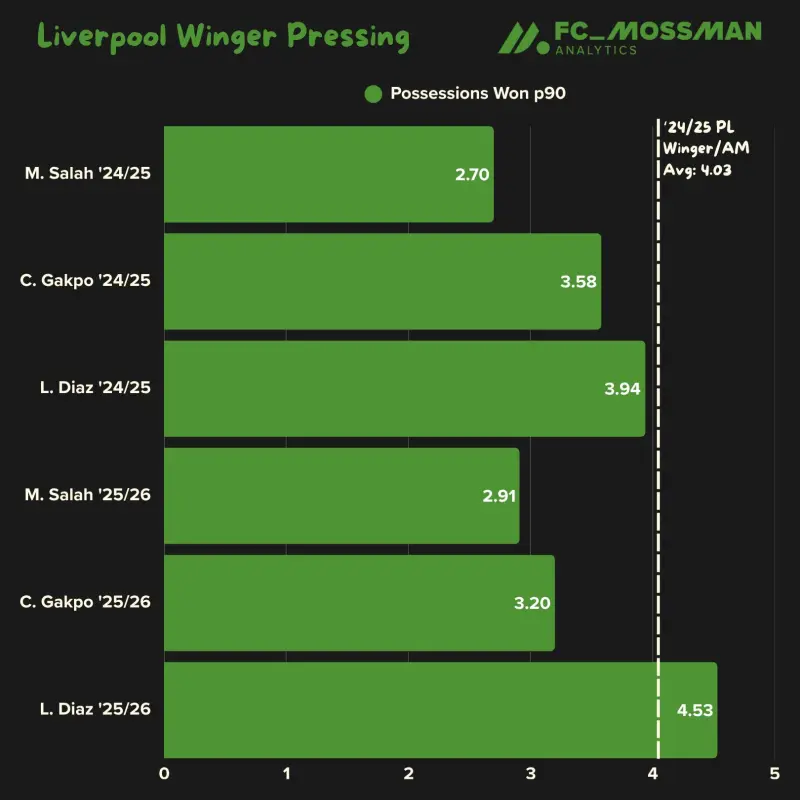 -邊鋒/前腰每90分鐘奪回球權(quán)次數(shù)中,博賢加克波位居倒數(shù)33%,旗角薩拉赫倒數(shù)5%,壓迫但薩相對(duì)上賽季還有所增多。數(shù)據(jù)