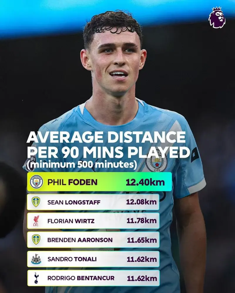 每90分鐘跑動(dòng)數(shù)據(jù) 維爾茨英超第三