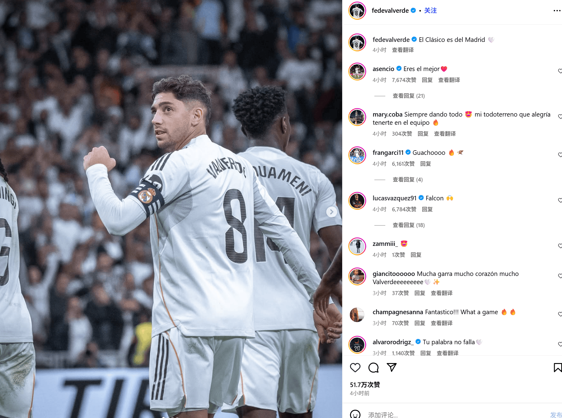 巴爾韋德賽后在社媒上發(fā)布了多張比賽圖片,德比并配文寫道:“國家德比屬于馬德里!馬德”
