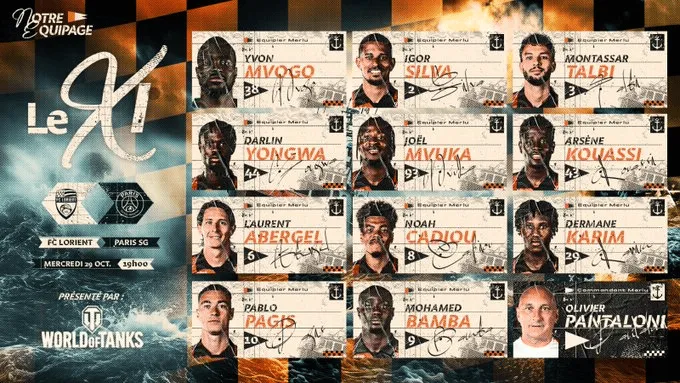 虎撲10月29日訊 法甲第10輪,洛里昂主場對陣巴黎圣日耳曼。賽前,雙方公布首發(fā)陣容: