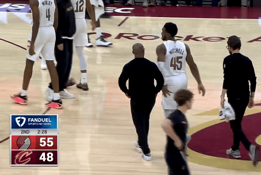 第二節(jié)比賽中,替補(bǔ)米切爾突破時(shí)腳滑出現(xiàn)輕微拉傷,米切隨后自己站起來(lái)走回替補(bǔ)席。爾突
