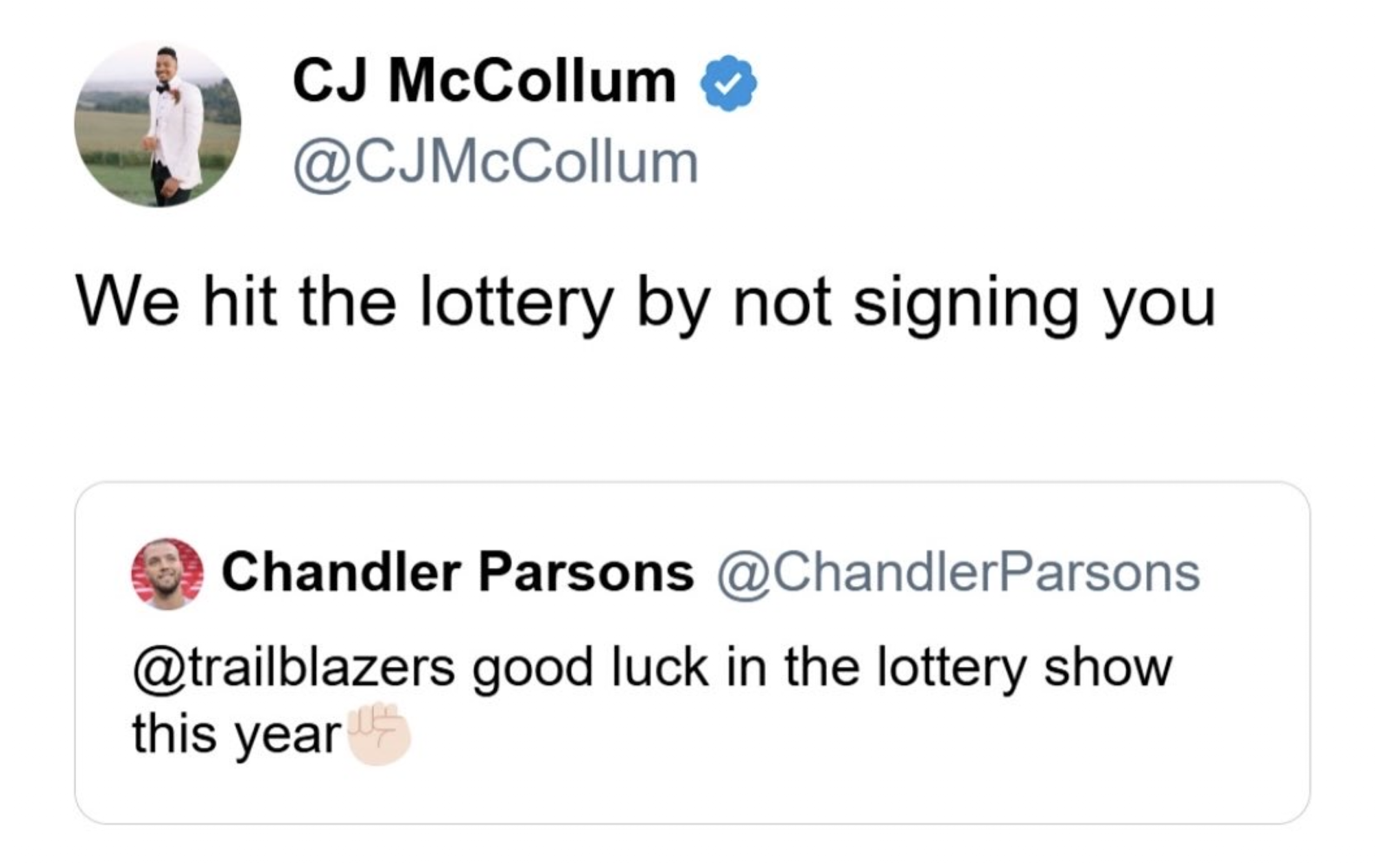 在那條推文中,板Ns別錢德勒-帕森斯寫道:“開拓者,板Ns別今年樂透抽簽好運(yùn)???。板Ns別” 隨后CJ-麥科勒姆回復(fù)道:“我們因?yàn)闆]簽?zāi)悴胖辛藰吠浮0錘s別”