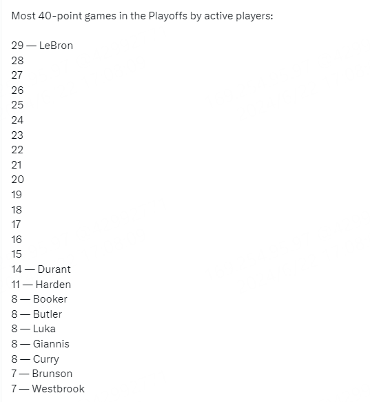 虎撲06月22日訊 今日美媒BronMuse列出一組數(shù)據(jù),為現(xiàn)役球員季后賽單場40+的役季次數(shù),詹姆斯29次斷崖式領(lǐng)先。后賽