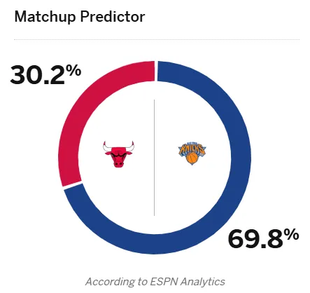 賽前,測明美媒ESPN對本場比賽進行了預(yù)測,牛vs尼公牛勝率為30.2%,公牛尼克斯勝率為69.8%。勝率
