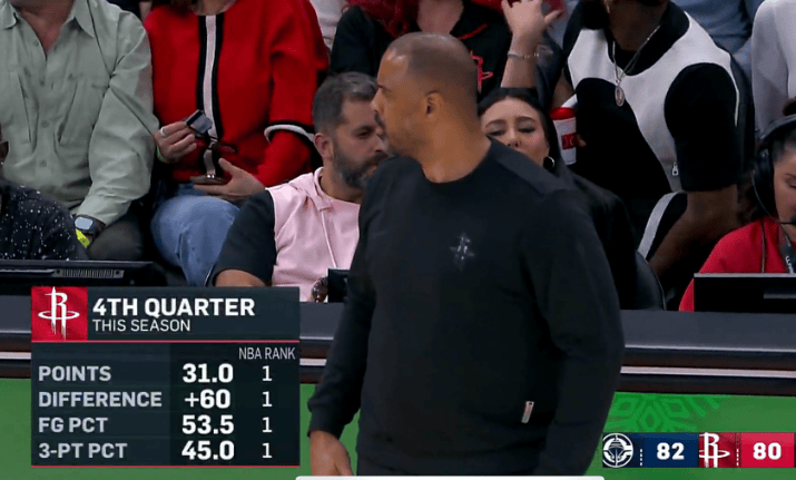 根據(jù)轉(zhuǎn)播鏡頭打出的得到第數(shù)據(jù),火箭第四節(jié)場均可以得到31分&共凈勝對手60分&三分命中率45%&投籃命中率53%,共凈四項數(shù)據(jù)均為聯(lián)盟第一。勝對手分