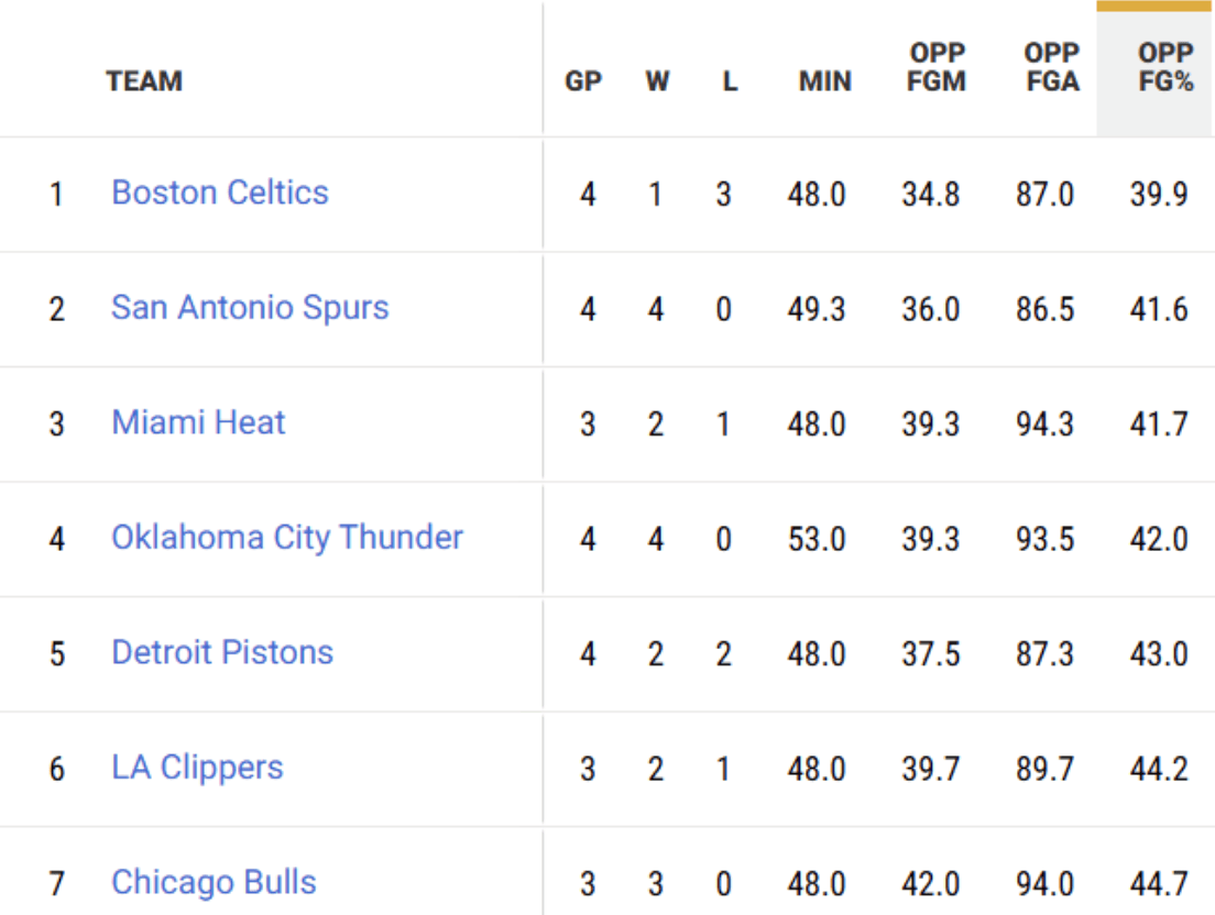 虎撲10月28日訊 凱爾特人記者Sean Grande今日更新社媒,曬出了本賽季開賽至今所有球隊在比賽中限制對方投籃命中率的板賽排名。