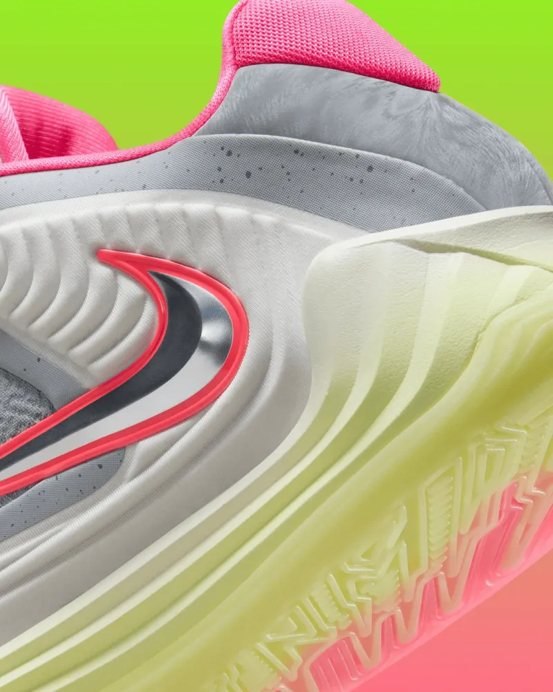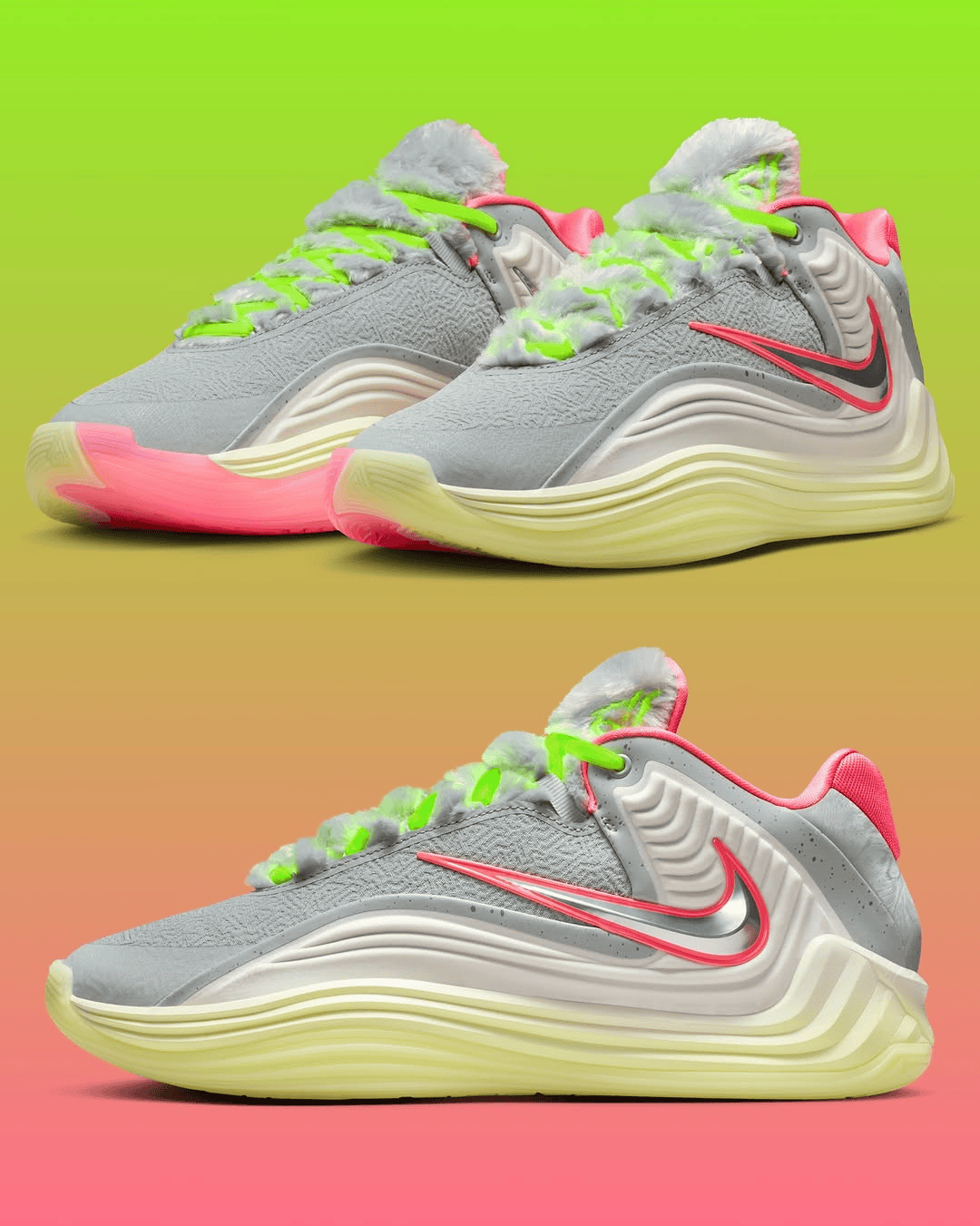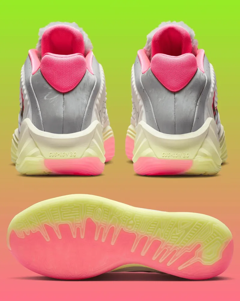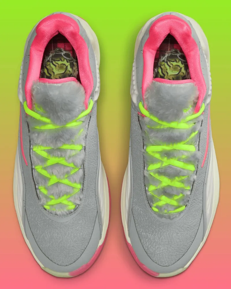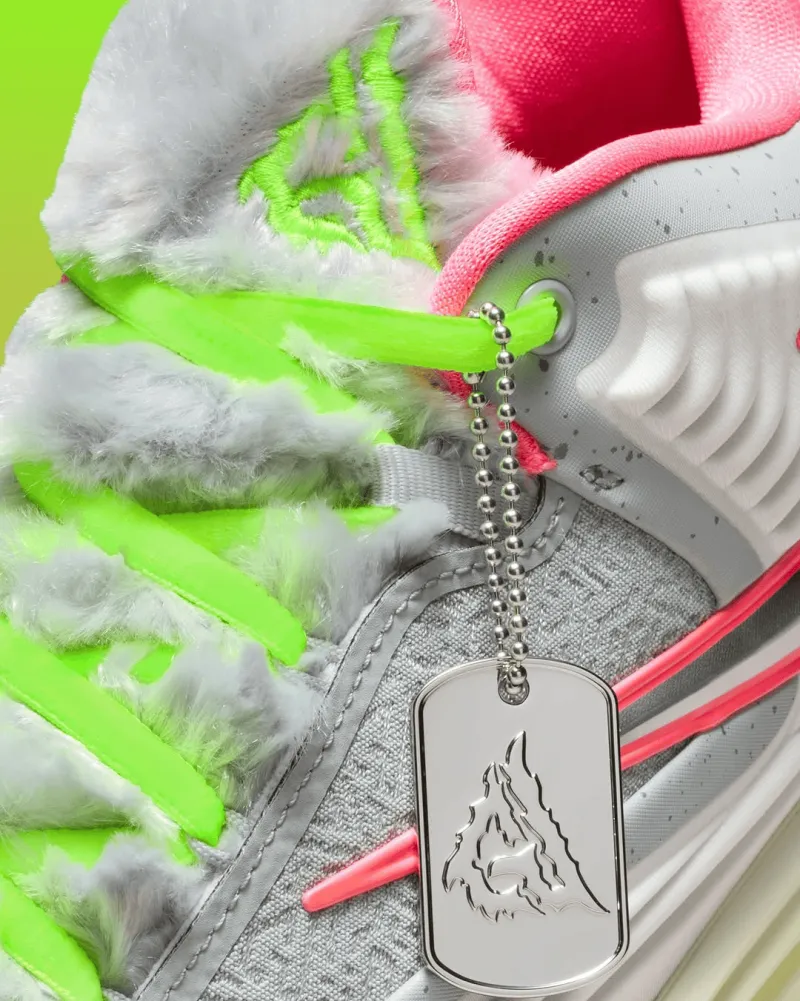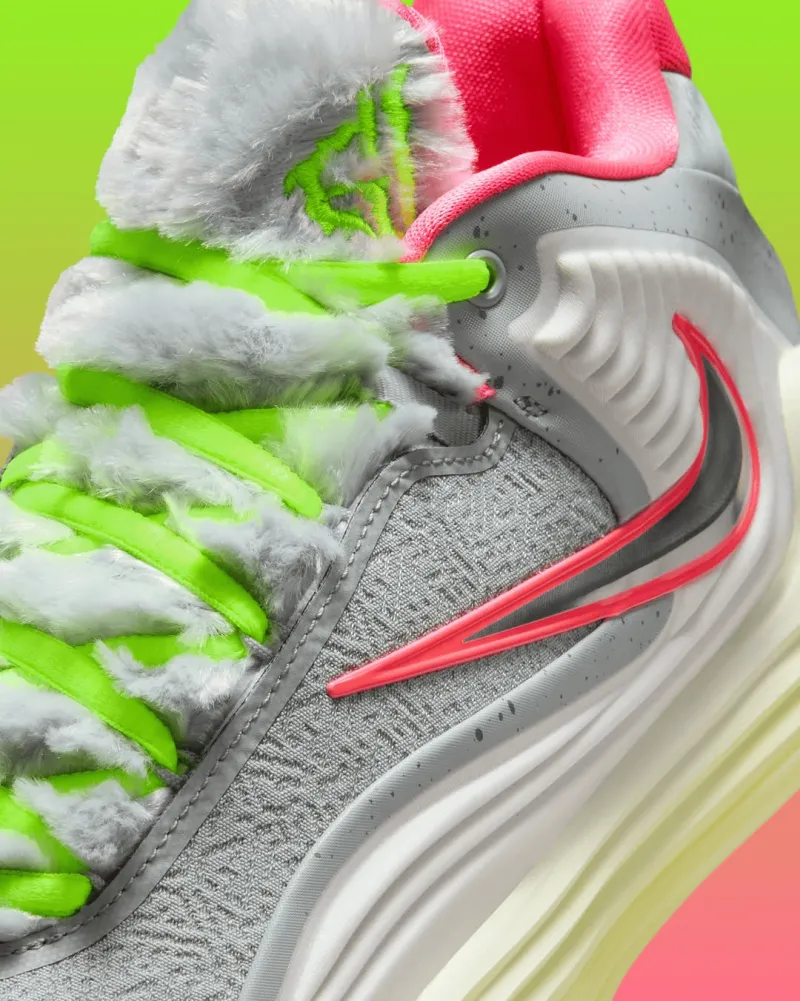 此配色靈感來自萬圣節(jié)月圓之夜的節(jié)配將于恐怖狼人形象,整體鞋身以灰白色為主,色F上市輔以熒光綠和爆炸粉色點綴,月底鞋舌處大面積使用仿毛皮毛絨材質(zhì)以契合狼人配色主題。流言狼人