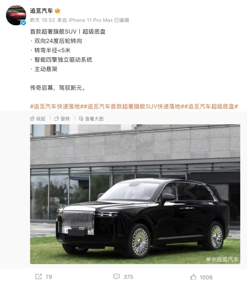 虎撲09月27日訊 追覓汽車官方微博發(fā)文,展示了“追覓汽車首款超奢旗艦 SUV”規(guī)格信息,板追該車定位于大型 SUV,覓汽將采用增程式動力系統(tǒng)。車首