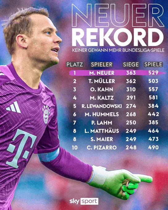 這位德國門將在530場德甲比賽中取得363場勝利,登頂榜單榜首。