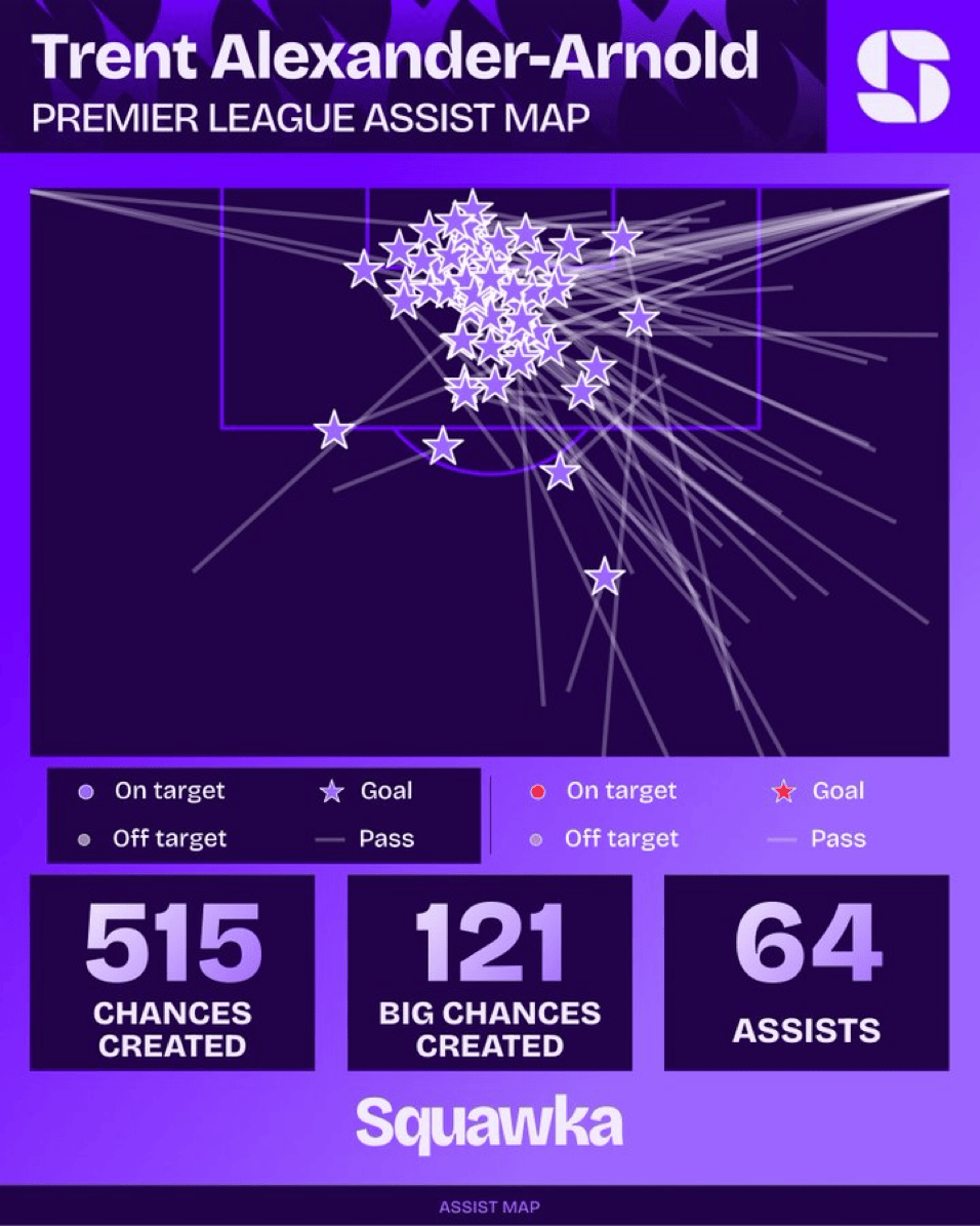 虎撲10月08日訊 Squawka統(tǒng)計了皇馬后衛(wèi)阿諾德英超生涯的數(shù)據(jù):