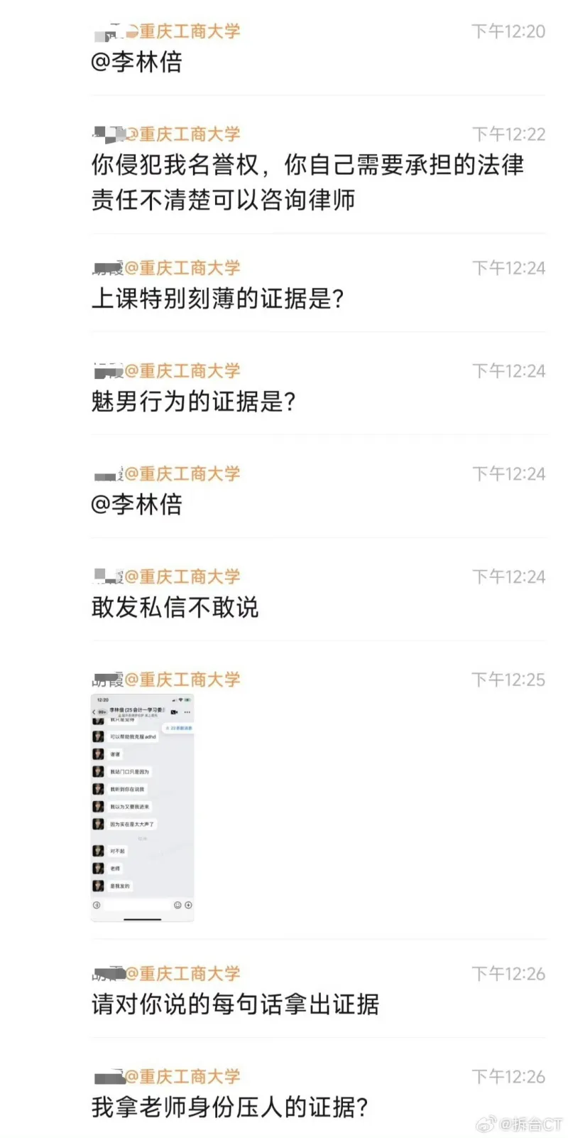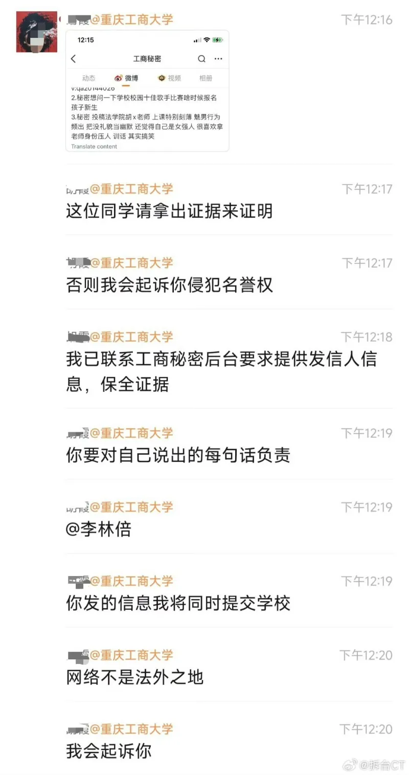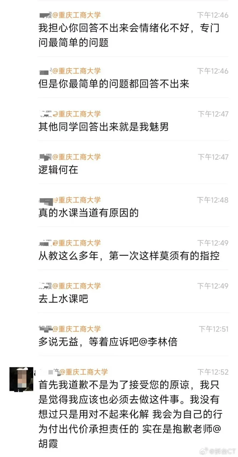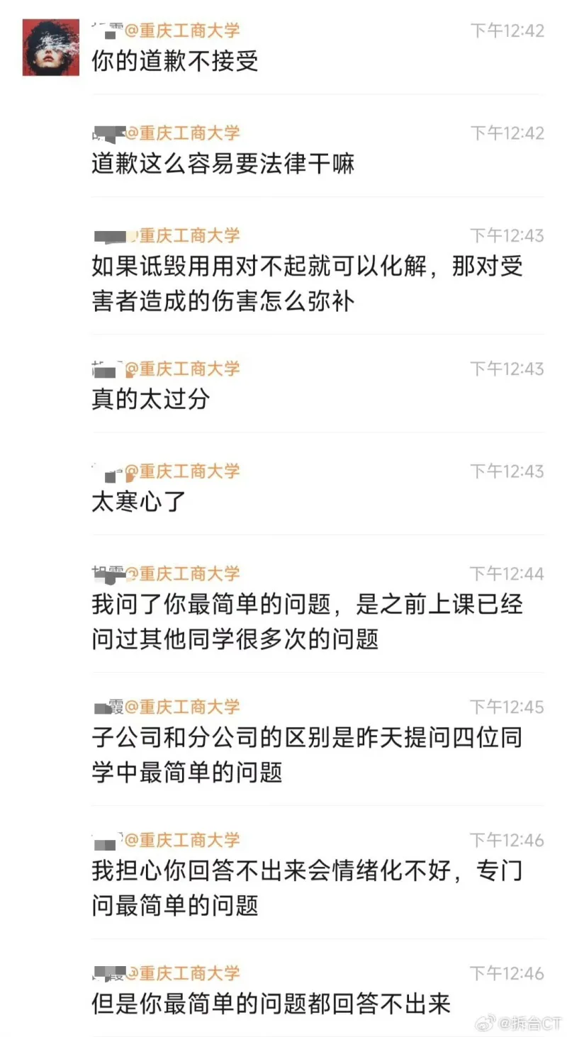 重慶工商大學(xué)女教授上課叫學(xué)生起來(lái)回答問(wèn)題,上課時(shí)老師提上把上課幾個(gè)男學(xué)生答出來(lái)了,問(wèn)的問(wèn)題有個(gè)女學(xué)生答不上來(lái)。法學(xué)下課后這個(gè)女生越想越氣,老師覺(jué)得自己被針對(duì)了,博造就找樹(shù)洞投稿說(shuō)老師「媚男」「覺(jué)得自己是刻薄女強(qiáng)人」「喜歡拿老師身份壓人」。